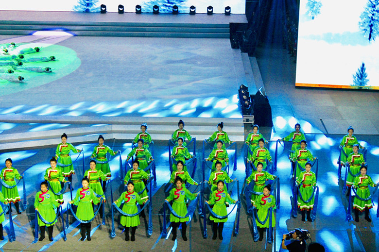 我校志愿者們與呼和浩特藝術(shù)學(xué)校的演員們共同合作,擔(dān)任開(kāi)場(chǎng)與結(jié)尾等節(jié)目的演出服務(wù)工作。節(jié)目中,身著綠色和藍(lán)色服飾的青年們象征著草原和藍(lán)天,手捧著藍(lán)色哈達(dá),展現(xiàn)出草原人民的熱情好客。青春洋溢的志愿者們,用她們活力熱情的表演為此次活動(dòng)增添了一抹亮麗的風(fēng)景。