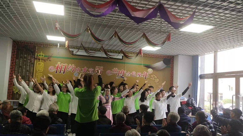 在志愿者總隊隊長寧邵斐的組織帶領下,志愿者們為老人們分發了水果,并準備了精彩的節目。不論是歡快的《幸福拍手歌》、鏗鏘有力的《不忘來時路,方知何所生》,還是婉轉悠揚的《鴻雁》、催人淚下的《夢中的額吉》,都迎來了老人們陣陣掌聲。其間,志愿者們陪老人們聊天,聽他們講述以前的故事,詢問他們的生活起居情況,幫助老人整理房間,讓老人感受到親人般的關懷和溫暖,大家有說有笑,暖意融融。