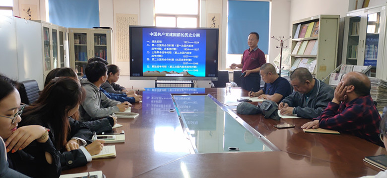 王福清院長結合“不忘初心,牢記使命”主題教育的背景,從開展主題教育重大意義、目標要求,學習了習近平總書記在“不忘初心,牢記使命”主題教育工作會議上的重要講話精神入手,結合中央革命根據地和中華蘇維埃共和國的歷史,闡述了井岡山精神、蘇區精神、長征精神、延安精神、抗戰精神、西柏坡精神的內涵。隨后,王院長結合蒙古學學院(翻譯學學院)歷史與發展,深刻闡釋了用中國革命精神培養優秀教學科研人才的科教報國初心。
