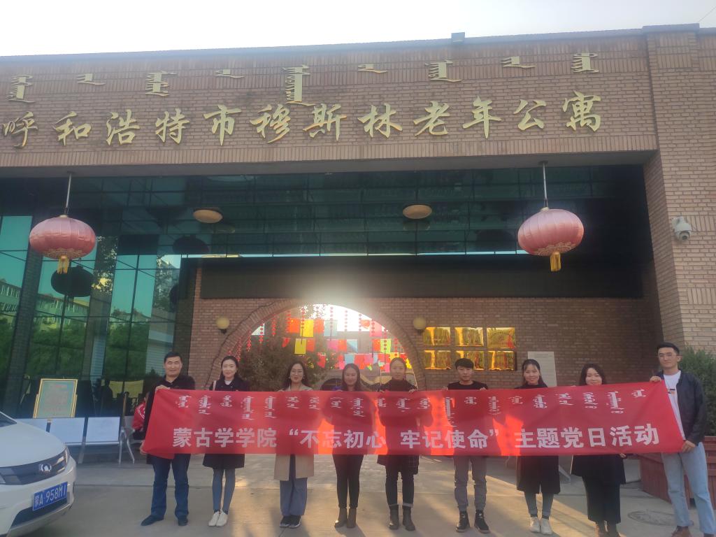 為更好的踐行“不忘初心、牢記使命”主題教育,通過開展志愿活動的方式,強化黨員學生為民服務、奉獻社會的責任感,10月21日下午,蒙古學學院與新聞傳媒學院學生黨支部前往呼和浩特市穆斯林老年公寓開展了“不忘初心、牢記使命”主題教育志愿服務活動。蒙古學學院、新聞傳媒學院學生黨支部書記根領、白淑華帶隊,支部全體黨員同學參加了活動。
