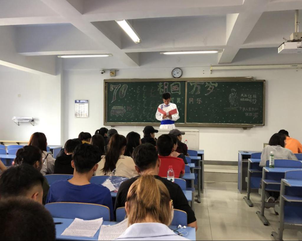 9月27日——9月28日期間,通過組織開展以“壯麗七十年,奮斗新時代”為主題的朗誦會,觀看愛國主義紅色影片《戰狼2》《湄公河行動》,紀念抗戰烈士等形式慶祝中華人民共和國成立70周年。過程中,19級民族班團支部在抗日將士公墓碑前唱響國歌來緬懷抗日英烈,在朗誦會中朗誦選手以飽滿的精神狀態、質樸的語言、動人的故事和真實的情感,詮釋了自己對祖國70年發展歷程的驚嘆和自豪,贏得了在場同學的陣陣掌聲。