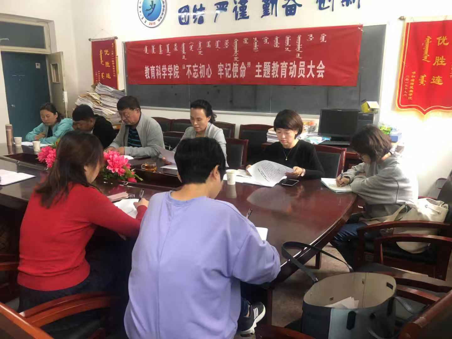 9月19日上午9點,在教育科學學院會議室舉辦“不忘初心、牢記使命”主題教育動員部署會議,我校“不忘初心、牢記使命”主題教育第二指導組組長胡日查老師、吳麗春老師出席本次會議,黨總支副書記娜仁其木格、各支部書記及委員、學生黨員代表參加此次會議,教工支部書記許曉芳主持會議。