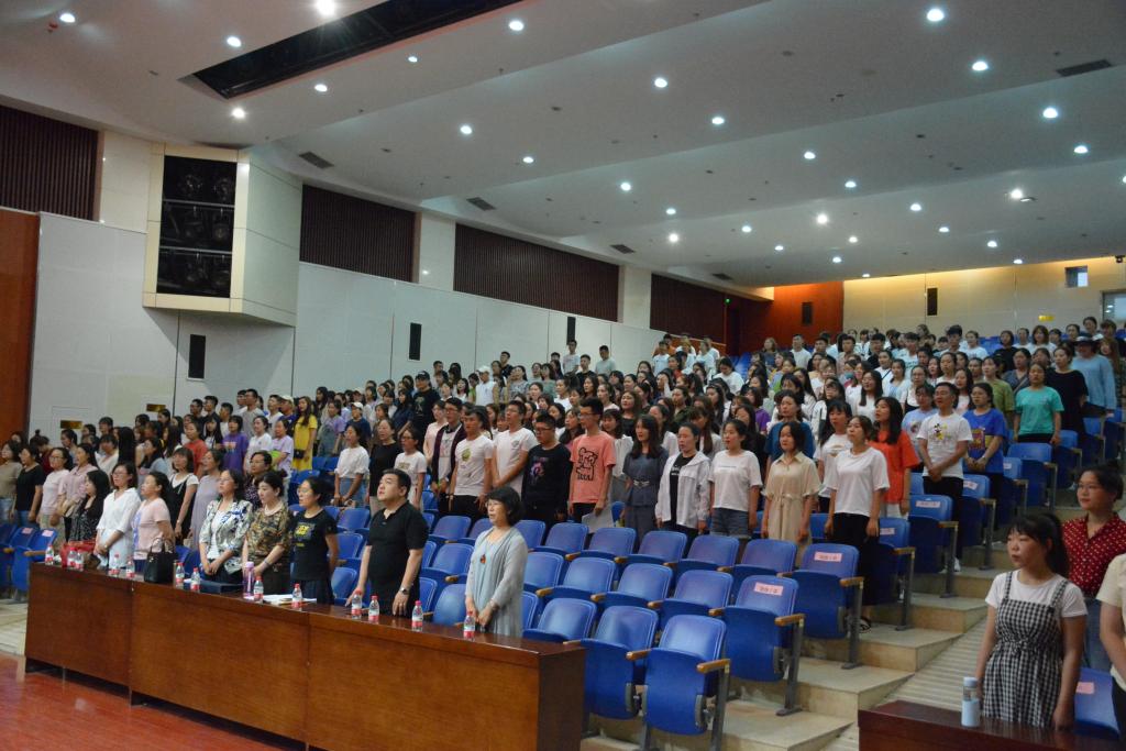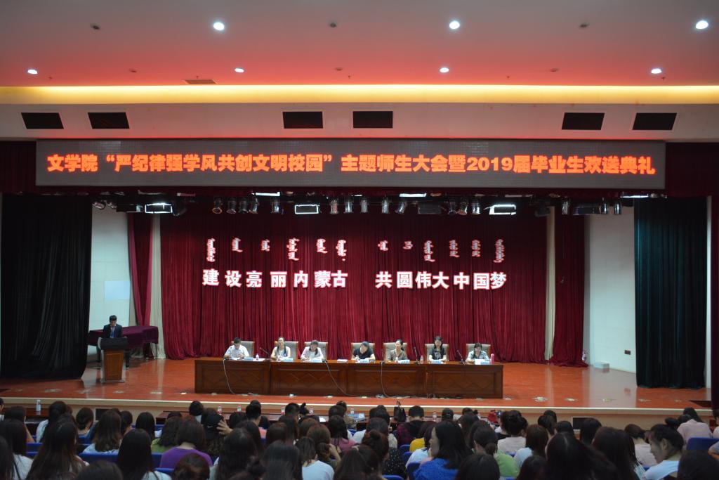 為狠抓學(xué)生紀(jì)律, 激發(fā)學(xué)生學(xué)習(xí)熱情,歡送2019屆畢業(yè)生,文學(xué)院于6月20日晚在圖書館二樓報(bào)告廳召開“嚴(yán)紀(jì)律、強(qiáng)學(xué)風(fēng)、共創(chuàng)文明校園”主題師生大會暨2019屆畢業(yè)生歡送典禮,文學(xué)院院長崔鳳珍、黨總支副書記包冬梅、副院長哈琴等近750名師生參加本次大會。