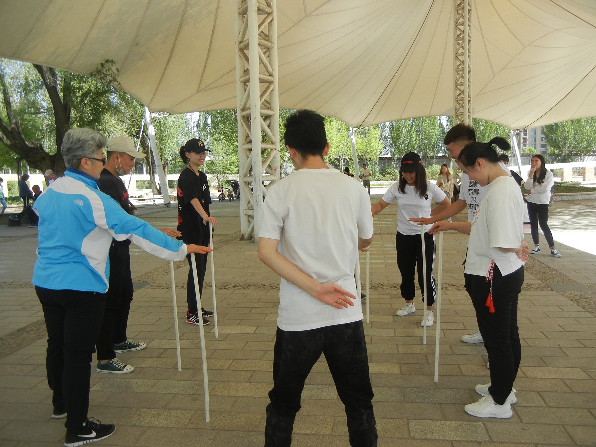 活動成員以團隊形式進入園區,建立活動場地和衛生角。在經過簡單快速的分組之后,順利的舉行了“不倒森林,七手八腳,穿越極限”等一系列游戲活動,在考驗個人能力和體力的同時,也提高了團隊的相互配合、分工協調能力。活動過后,大家圍坐一圈,在分享食物的同時也分享著在日常學習生活中的收獲。