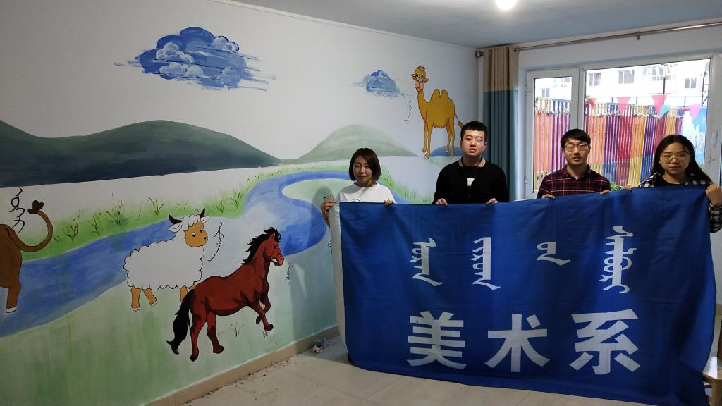 本次活動(dòng)充分發(fā)揮了美術(shù)系學(xué)生的專業(yè)特長(zhǎng),同學(xué)們?yōu)檫@所幼兒園墻體描繪出民族文化特色的圖案,從孩子的視野角度出發(fā),在墻面上生動(dòng)描繪了內(nèi)蒙古地區(qū)的民族特色風(fēng)貌以及草原上生活的動(dòng)物,使從小生活在城市里的蒙古族小朋友能夠感受到草原的風(fēng)貌,為孩子的心中種下民族團(tuán)結(jié)的種子。