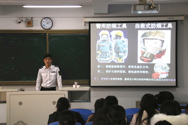 曹教官從高校火災案例講起,結合校園消防安全管理、基本消防常識和危急時刻逃生方案,闡述了開展消防安全教育的重要性,指出了目前高校消防安全存在的主要隱患,強調了在火災發生后必須掌握的逃生方式。在火災案例講解過程中,曹老師重點強調了對于寢室私拉電線、違規大功率用電等常見的不良生活習慣帶來的危險性,并呼吁學生堅決禁止床上用電腦、宿舍吸煙等惡習。曹老師還指出,作為高校學生要主動學習消防安全知識,掌握必要逃生技能。