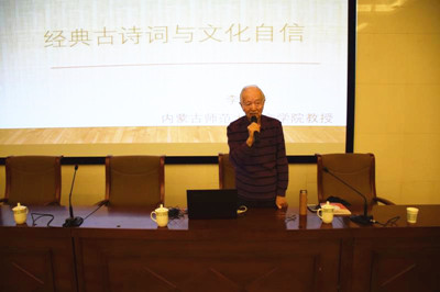 講座中,李淑章教授從“文化自信”和“經典古詩詞”兩個方面,深入淺出地分析了“文化自信”的意義和內涵。他指出,中國優秀的傳統文化是國家發展的基礎,中國的社會主義文化是面向世界、面向未來、面向現代化的,是民族、科學、大眾的文化。在新時代統籌推進“五位一體”總體布局中,我們要把文化建設放在重要地位,因為優秀的傳統文化是流淌在我們民族血液里的發展基因和力量,是“四個自信”的取之不盡用之不竭的源泉。李淑章教授特別闡述了“經典古詩詞”對“文化自信”的意義和影響,并以王維《九月九日憶山東兄弟》為例,就中國古詩中的“對寫法”,即“主客移位法”,進行了深入講解。李淑章教授注重引導進行文化思考,使與會師生受益匪淺。精彩的演講,不時引起陣陣熱烈的掌聲。