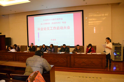 畢業生撰寫畢業論文是大學本科人才培養的一個重要環節,也是檢驗學生綜合素質與實踐創新能力的有效途徑。為進一步做好2018屆本科生畢業論文工作,提高本科生畢業論文質量,11月16日上午10時,外語系在圖書館一樓報告廳召開了2018屆日語專業及小學教育(英語方向)專業畢業論文工作啟動大會。啟動大會由英語教研室主任紅霞主持,外語系日語教研室、英語教研室畢業論文指導教師及2018屆日語專業、小學教育(英語方向)專業全體畢業生參加了本次會議。