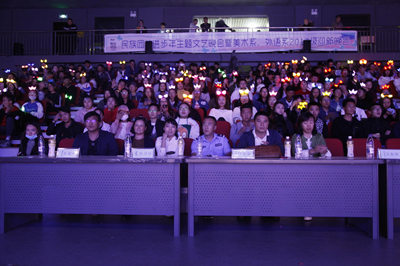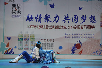 9月27日晚,美術(shù)系和外語系在演播廳聯(lián)合舉辦了“融情聚力·共圓夢想”民族團(tuán)結(jié)主題晚會暨2017級迎新晚會。美術(shù)系團(tuán)總支書記白永泉、外語系團(tuán)總支書記王春梅、外語系2017級班主任代表曼都呼、美術(shù)系2017級班主任代表格日樂以及400多名學(xué)生觀看晚會。