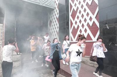 首先,保衛(wèi)處趙瑞俊老師詳細給學生們講解了基本消防知識和遇到火災時的逃生知識。接著,模擬情景為近200名傳媒系師生正在演播廳組織活動,突然有老師發(fā)現(xiàn)濃煙四起,疑似火災發(fā)生,老師立刻組織學生緊急疏散,大家用濕毛巾捂住口鼻有序撤離。最后,全體師生從演播廳內(nèi)疏散后由班長清點上報人數(shù),并以班級為單位在籃球場內(nèi)整隊集結(jié)。