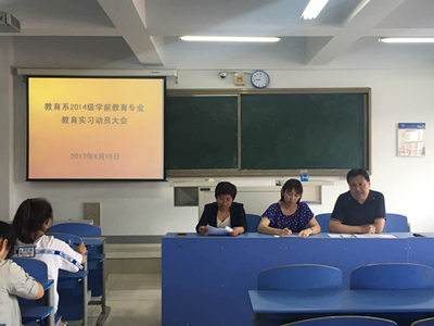 教育系于2017年6月16日上午8時30分,在都林樓402教室召開了2014級學前教育專業教育實習動員大會。教育系系主任劉根歲、2014級學前教育班班主任及全體學生參加了會議。
