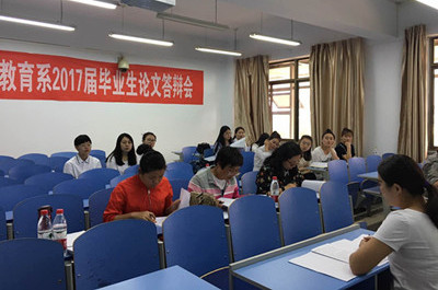 答辯會分四個小組進行,每個小組由4-5名教師組成評審委員會。在答辯過程中,首先由畢業生闡述論文選題緣由、意義及主要研究內容等,同時答辯委員會委員對每位畢業生的論文進行認真審閱,并結合畢業生的論文內容提出與該研究相關的問題,學生認真回答;隨后,答辯委員就其答辯內容及其體現出的學術思想等方面進行了點評。整個答辯過程緊張而嚴肅,充分體現了教育系師生的專業知識水平與嚴謹的科學態度。