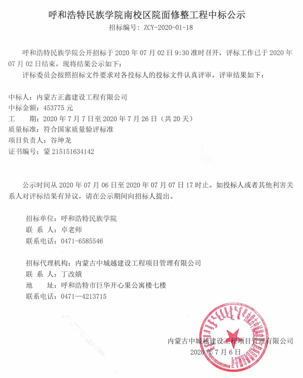 呼和浩特民族學院南校區院面休整工程中標公示