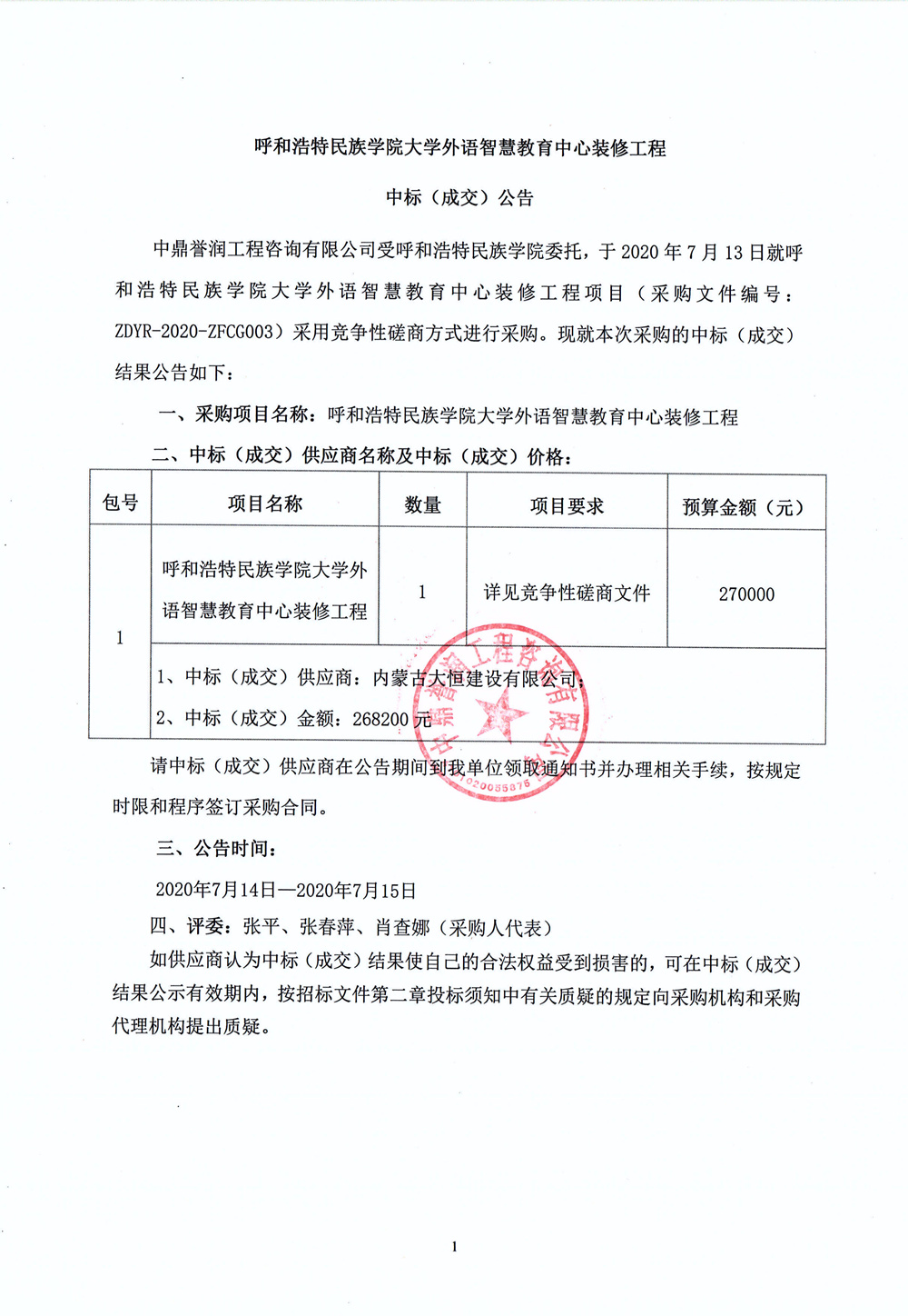 呼和浩特民族學院大學外語智慧教育中心裝修工程中標(成交)公告