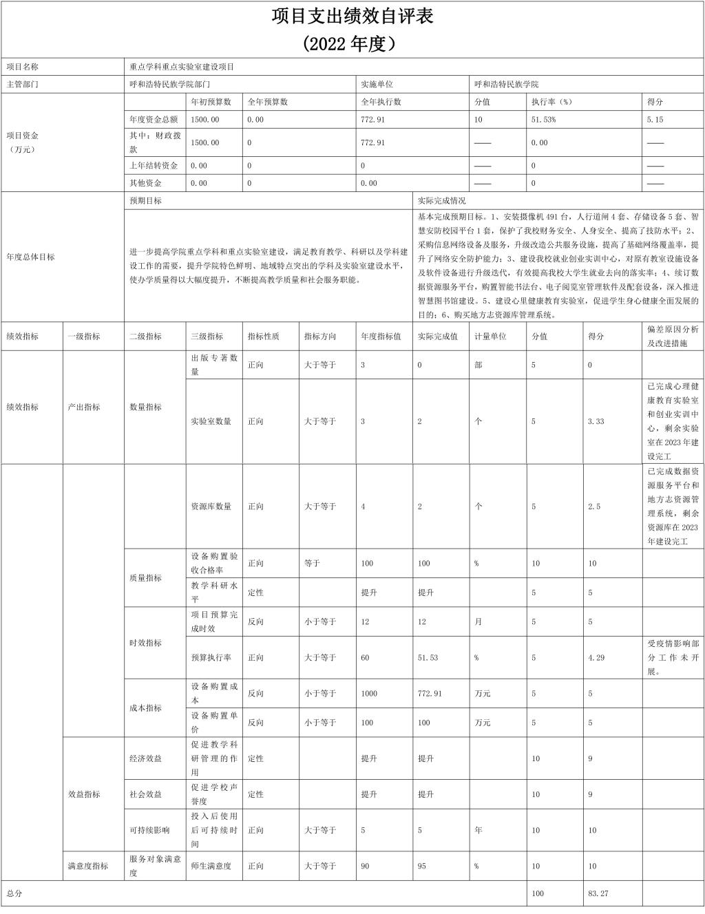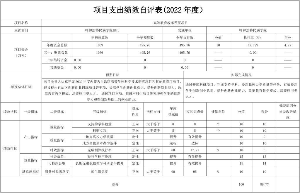 本次績效評價對象為呼和浩特民族學院2022年重點學科重點實驗室建設項目,涉及預算資金1500萬元。