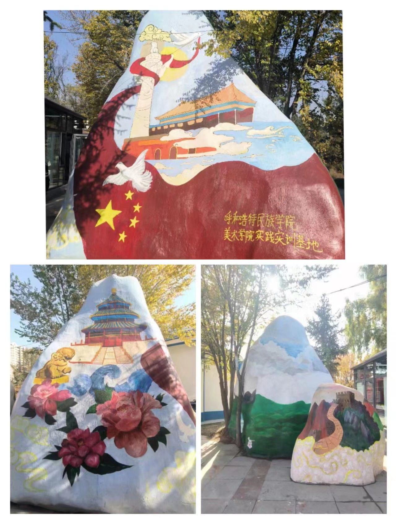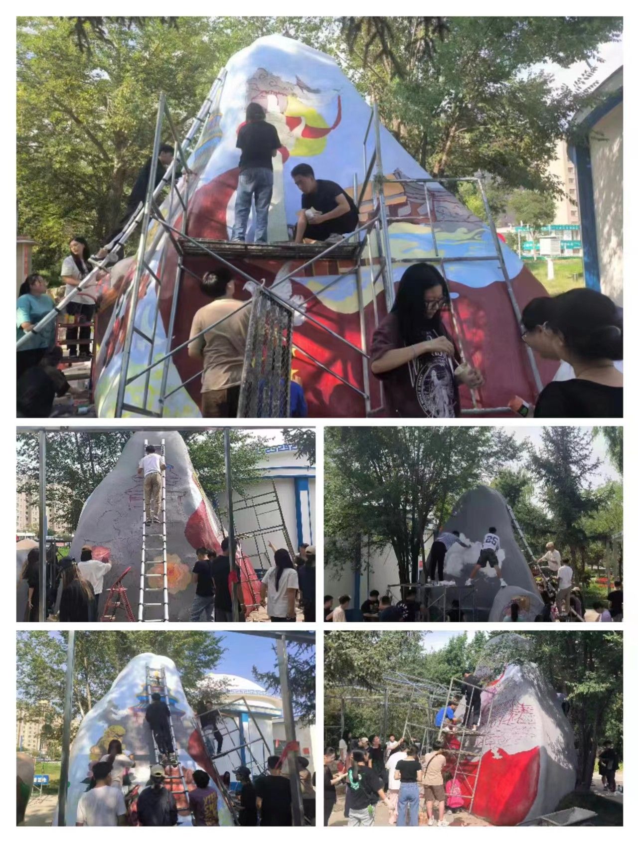 “紅石榴”志愿服務主題公園坐落于通道北街和成吉思汗大街交匯處西北角。園內設有同心廣場、紅石榴造型雕塑、北疆文化長廊等多個宣傳載體,其中四面菱形高達六米的中華文化符號景觀石的彩繪工作由我院團總支書記魏偉帶領黨員志愿者服務隊累計120余人次,歷時15天,累計服務時長2000小時完成。志愿服務隊根據內蒙古北疆志愿服務聯合會的需求,本著弘揚“奉獻、友愛、互助、進步”的志愿服務精神,利用每天課余時間,科學統籌、合理安排,分工明確,提前定稿,做好前期準備工作;開工后又遇暴雨沖刷,重新返工,全力補救,幾經艱辛,完美呈現出天安門廣場、天壇公園、萬里長城等最具代表性的畫面。