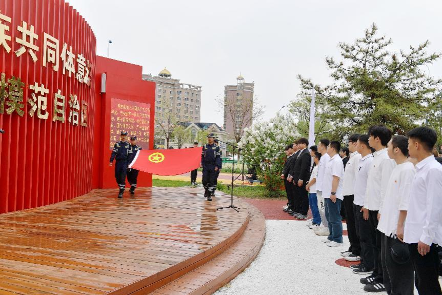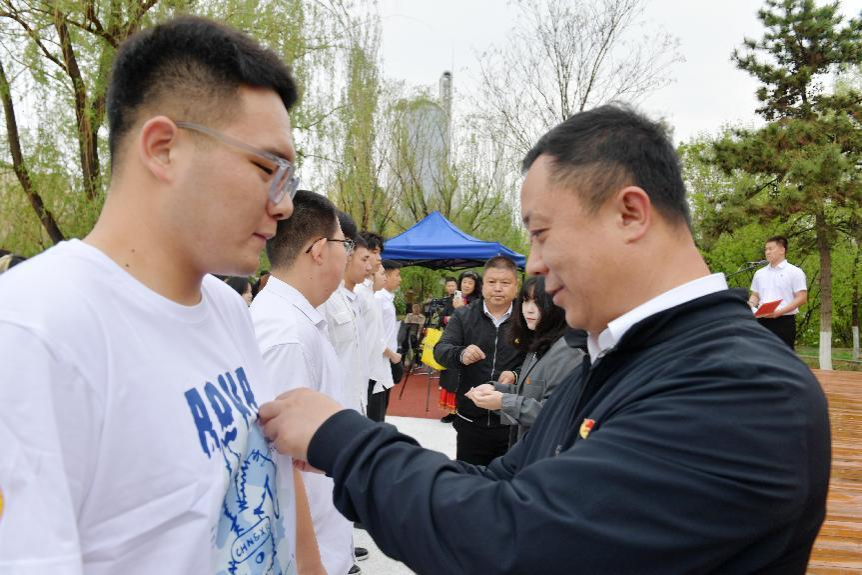 為深入學習貫徹習近平新時代中國特色社會主義思想,貫徹落實習近平總書記關于青年工作的重要論述,激發(fā)廣大團員和青年紀念和傳承五四精神,勇?lián)啻菏姑幾鰰r代新人,4月28日上午,呼和浩特民族學院美術學院團總支與回民區(qū)團委、內(nèi)蒙古北疆志愿服務聯(lián)合會、內(nèi)蒙古師范大學青年政治學院、內(nèi)蒙古建筑職業(yè)學院等四家單位在回民區(qū)“紅石榴”志愿服務主題公園聯(lián)合舉辦了“青春奮進新時代 挺膺擔當向未來”2024年集中規(guī)范性入團儀式。美術學院團總支書記魏偉、輔導員吳豐林帶領2024年新入團團員和“紅石榴”志愿服務隊成員參加活動。