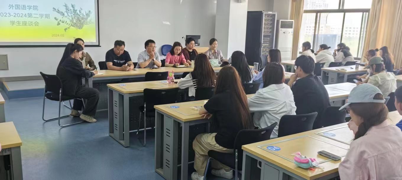 5月9日,外國語學院于都林樓606召開學生座談會,外國語學院副院長秦紅喜、紅鴿,英語教研室主任烏優、翻譯教研室主任海拉、日語教研室教師白紅梅、學工辦主任潘興安、教學秘書張羽熙以及各個班級的班干部和學生代表參加了此次座談會。座談會由副院長秦紅喜主持。