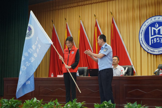 饒樹新宣讀授予《呼和浩特市禁毒協(xié)會(huì)呼和浩特民族學(xué)院志愿者分隊(duì)》旗幟決定,并為領(lǐng)隊(duì)授旗。王凱鵬帶領(lǐng)我校首批禁毒志愿者分隊(duì)參與禁毒工作宣誓。劉永達(dá)對(duì)做好我區(qū)禁毒工作作了重要講話。