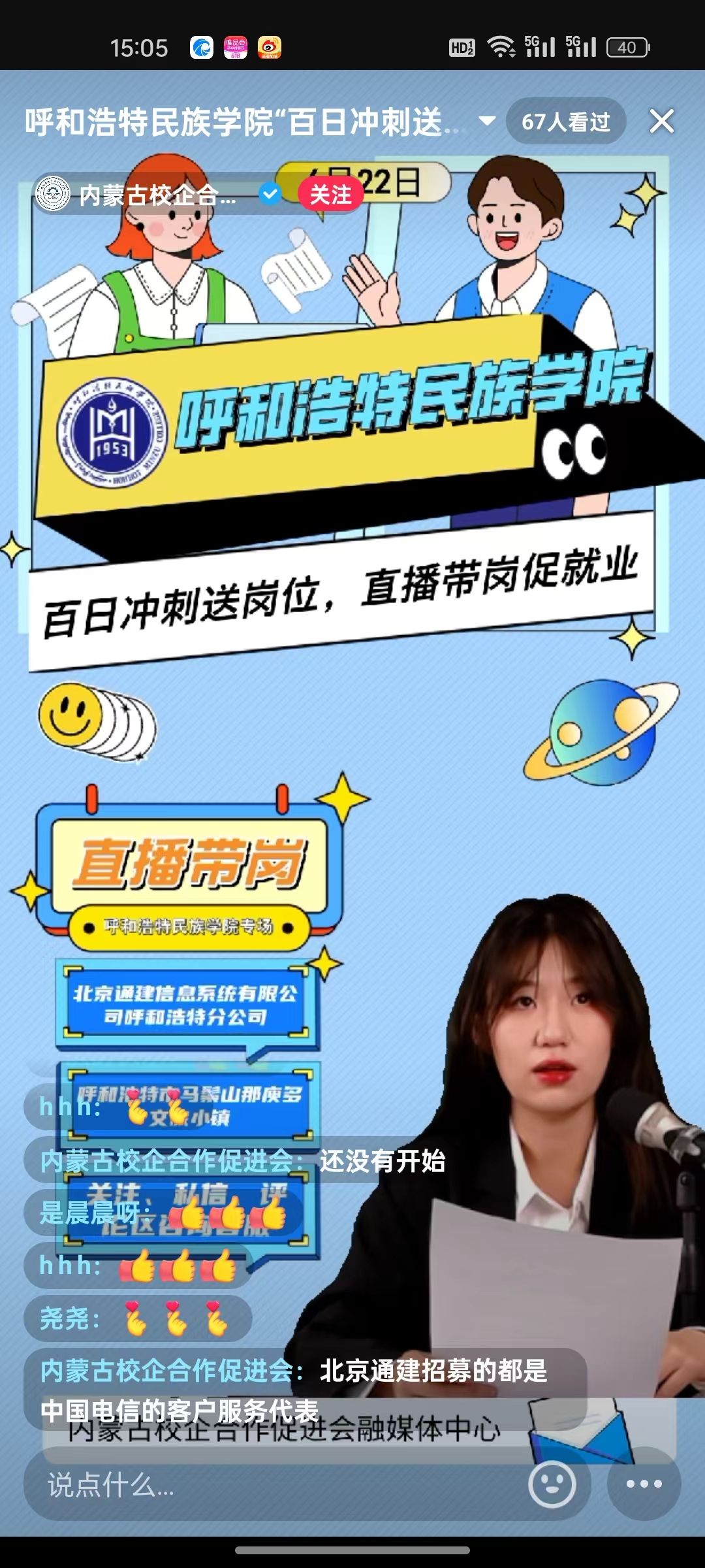 本次直播帶崗活動是學校“百日沖刺”促就業攻堅行動的一部分。下一步,學校將持續為畢業生精準搭建就業供需平臺,解決暑期線下招聘受時間、場地限制等問題,降低畢業生搜尋招聘信息的時間成本,實現就業服務和就業崗位的觸屏可及,確保畢業生高質量充分就業。