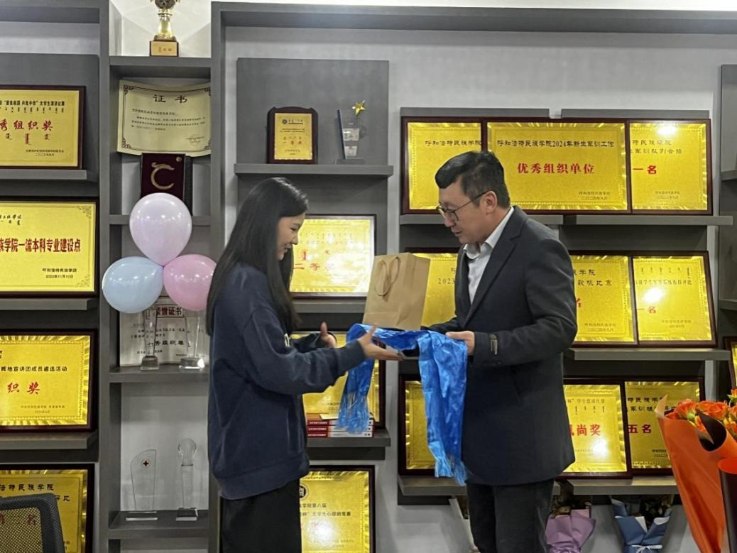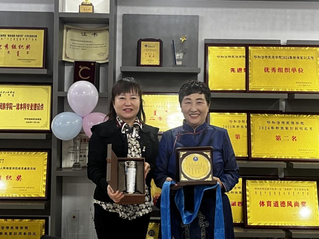 隨后,學院黨總支書記蘇倫高娃、額爾敦畢力格為白塔娜頒發紀念獎章,表達對白塔娜的崇高敬意和誠摯祝福。