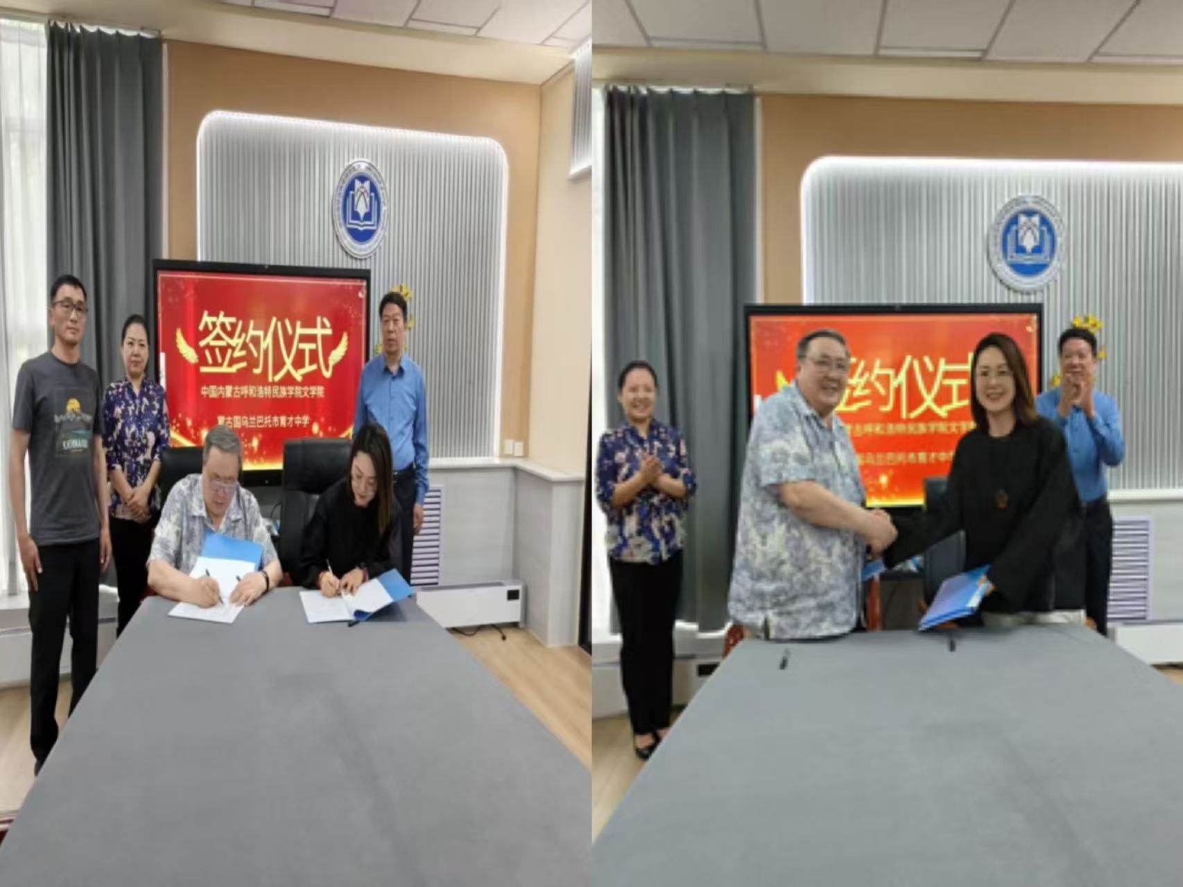 隨后,文學院與蒙古國育才中文學校簽署合作意向協議,擬在畢業生就業、學生實踐、師生交流、共建平臺等方面建立長期合作關系。