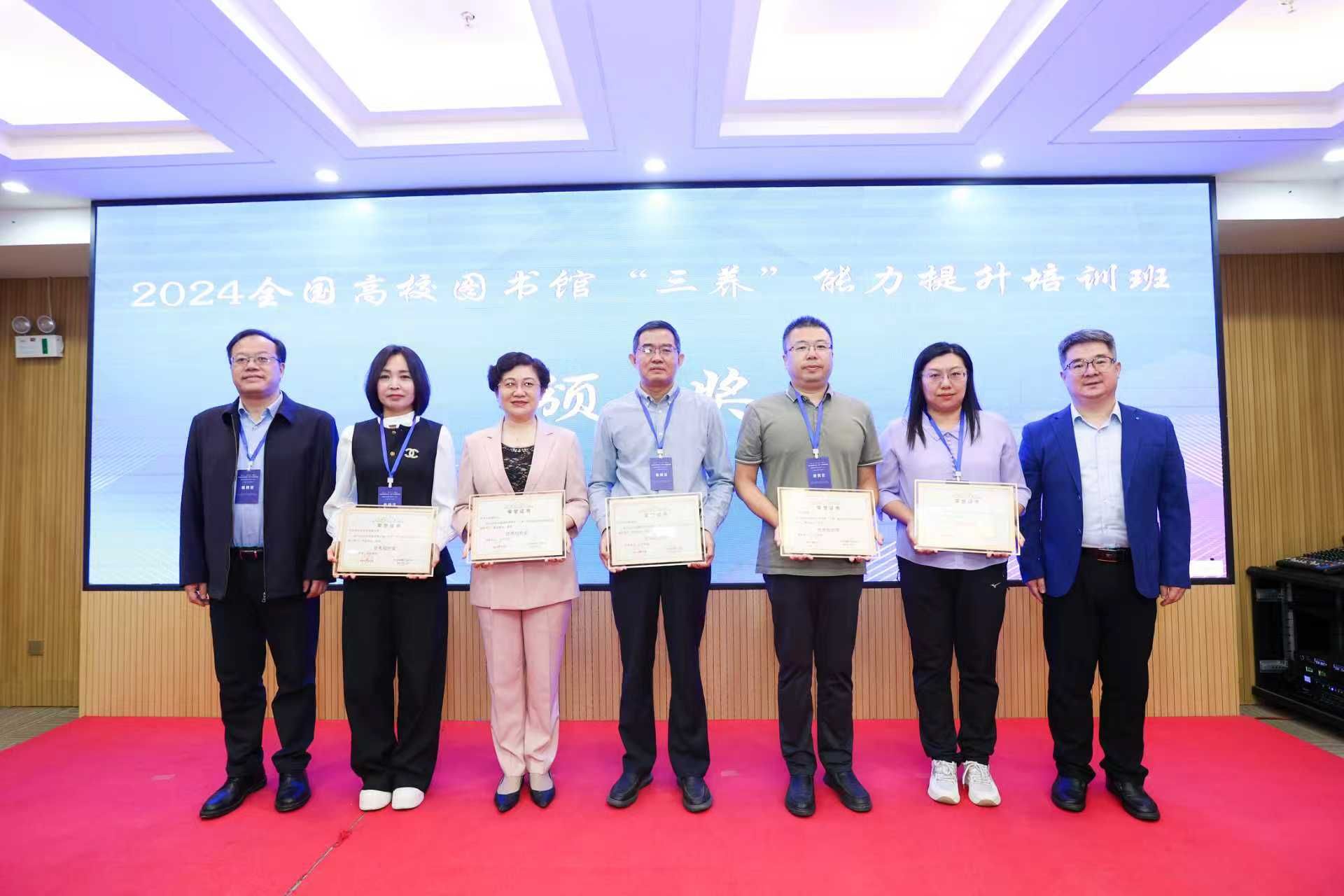 儀式上,主辦方為2024全國高校圖書館“三養”能力提升培訓班獲獎單位頒發了獲獎證書。2024年我校圖書館積極組織館員參加以強化館員信息素養、學術素養與文化素養為主旨的全國高校圖書館“三養”能力提升培訓班,參與人數和完成率均位居自治區前列,我校圖書館憑借參與培訓的積極態度和出色的組織能力榮獲“優秀組織獎”。圖書館參考咨詢部主任薛芳作為優秀組織單位獲獎代表發表了獲獎感言,分享了培訓在提升館員信息、學術與文化素養方面的顯著成效,并對2025年培訓的前沿性和創新性表達了熱切期待。
