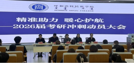 為進一步鼓舞考研學子士氣,提供精準高效的備考支持,10月20日晚,學校在鑄牢中華民族共同體意識教育館思想政治教育實踐教學基地舉辦“精準助力 暖心護航”2026屆考研沖刺動員大會。會議由教務處副處長青格樂圖主持,2026屆考研班100余名學生參會。