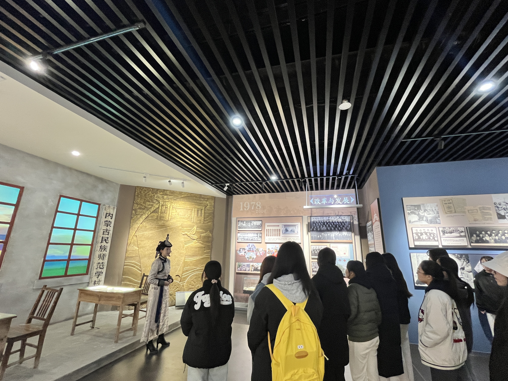 跟隨著講解員的腳步,同學們依次參觀了“七秩求索”“時代風華”“春華秋實”“黨的建設”“展望未來”五個展廳,一張張老照片重現著光輝燦爛的校園歷史,一段段文字訴說著引人入勝的辦學故事,這些獨家記憶匯成了一部完整的學校發展史。同學們重溫了無數學子奮斗前行的歷程,更看到了呼和浩特民族學院同時代進步的腳印。對學校“崇正、尚智、務本、傳承”的校訓精神有了更深刻地理解和體會。