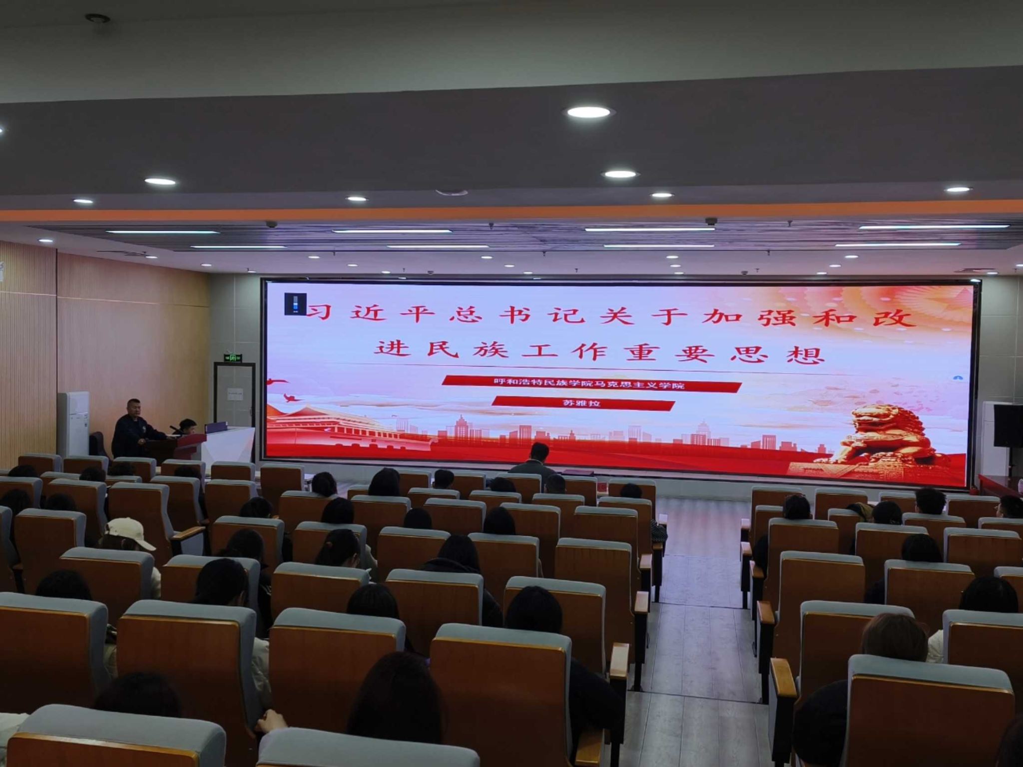 蘇雅拉以習近平總書記關于加強和改進民族工作重要思想為題,詳細講解了中華民族共同體形成的因素及強化過程,帶領學生全面、準確認識新形勢下黨的民族工作的時代背景,了解新時代民族工作面臨的問題及任務。馬克思主義學院專職輔導員姚培春及各年級120余名學生聆聽了講座。