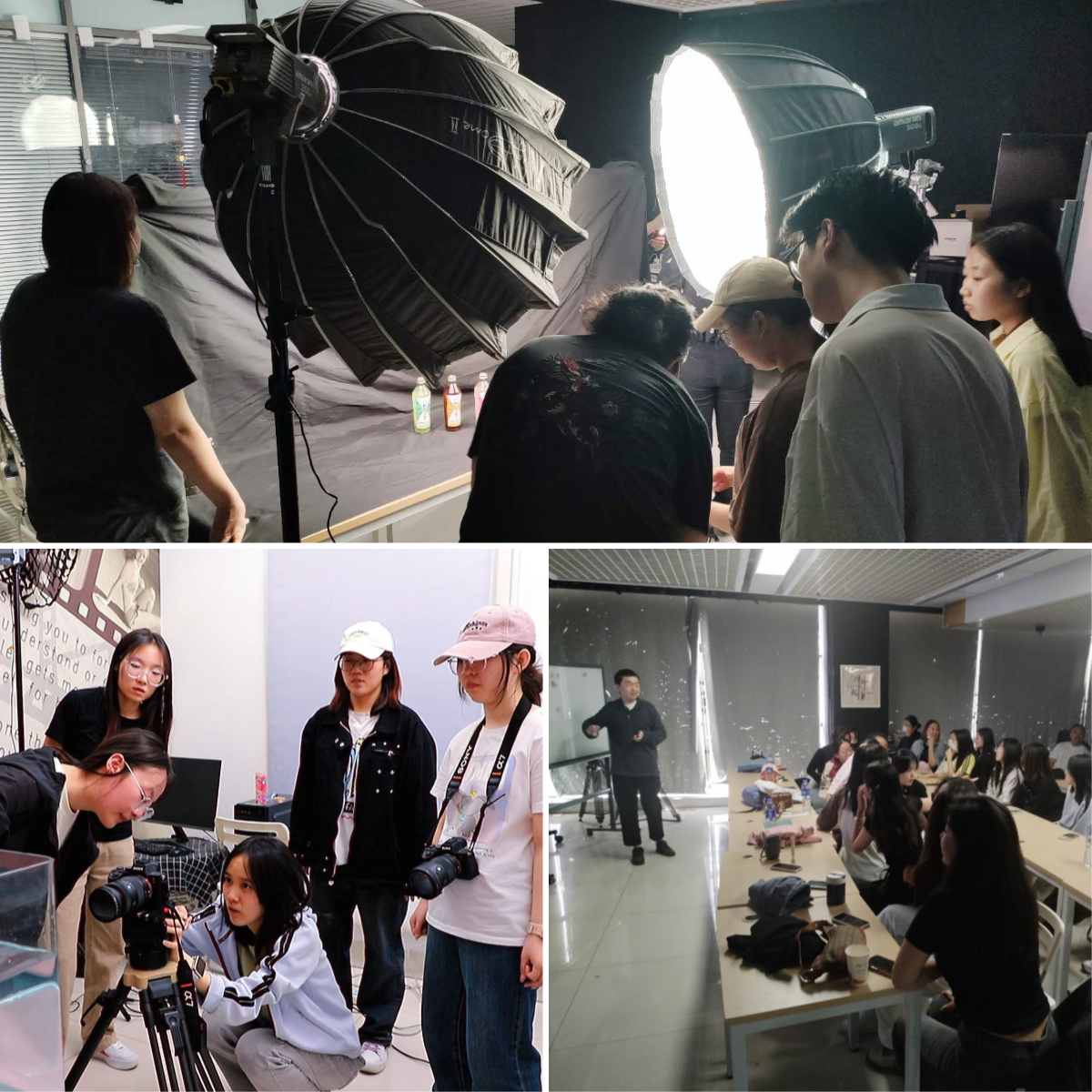 見習第一周是專業能力集中實訓,由學院合作企業——華龍新影(北京)教育科技有限公司負責,內容包括傳媒影像行業前沿動態分享、就業前景分析、專業燈光布設和短視頻策劃編播等。學生按組別各自攝制劇情短片、訪談、TVC、MV,另設花絮組記錄臺前幕后細節。