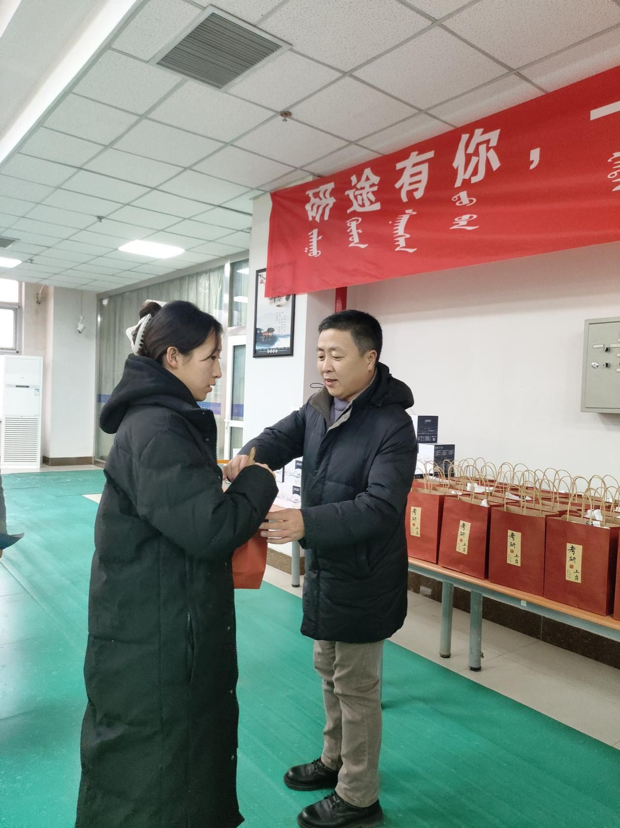 為緩解考研學(xué)子備考?jí)毫Γ奈杩佳惺繗猓?2月12日,教務(wù)處組織開(kāi)展“研途有你,一路暖心”考研學(xué)生慰問(wèn)活動(dòng),教務(wù)處副處長(zhǎng)額日德木圖代表學(xué)校為考研學(xué)生送去了考試必備的文具套裝和牛奶。