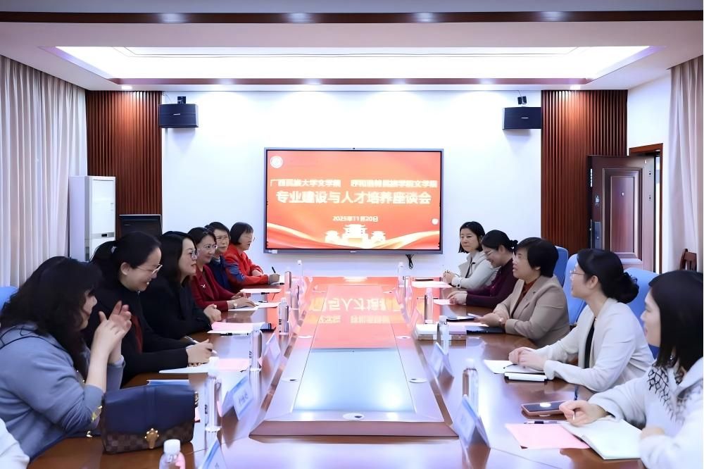 座談會上,廣西民族大學(xué)文學(xué)院陸曉芹院長、廣西民族師范學(xué)院文學(xué)與傳媒學(xué)院陸漢軍院長對我校文學(xué)院一行到訪表示熱烈歡迎,并詳細(xì)介紹了兩所院校在歷史沿革、學(xué)科布局、師資隊伍、專業(yè)建設(shè)、課程體系、教學(xué)改革、科研創(chuàng)新、學(xué)生工作等方面的總體情況、特色做法與顯著成效。