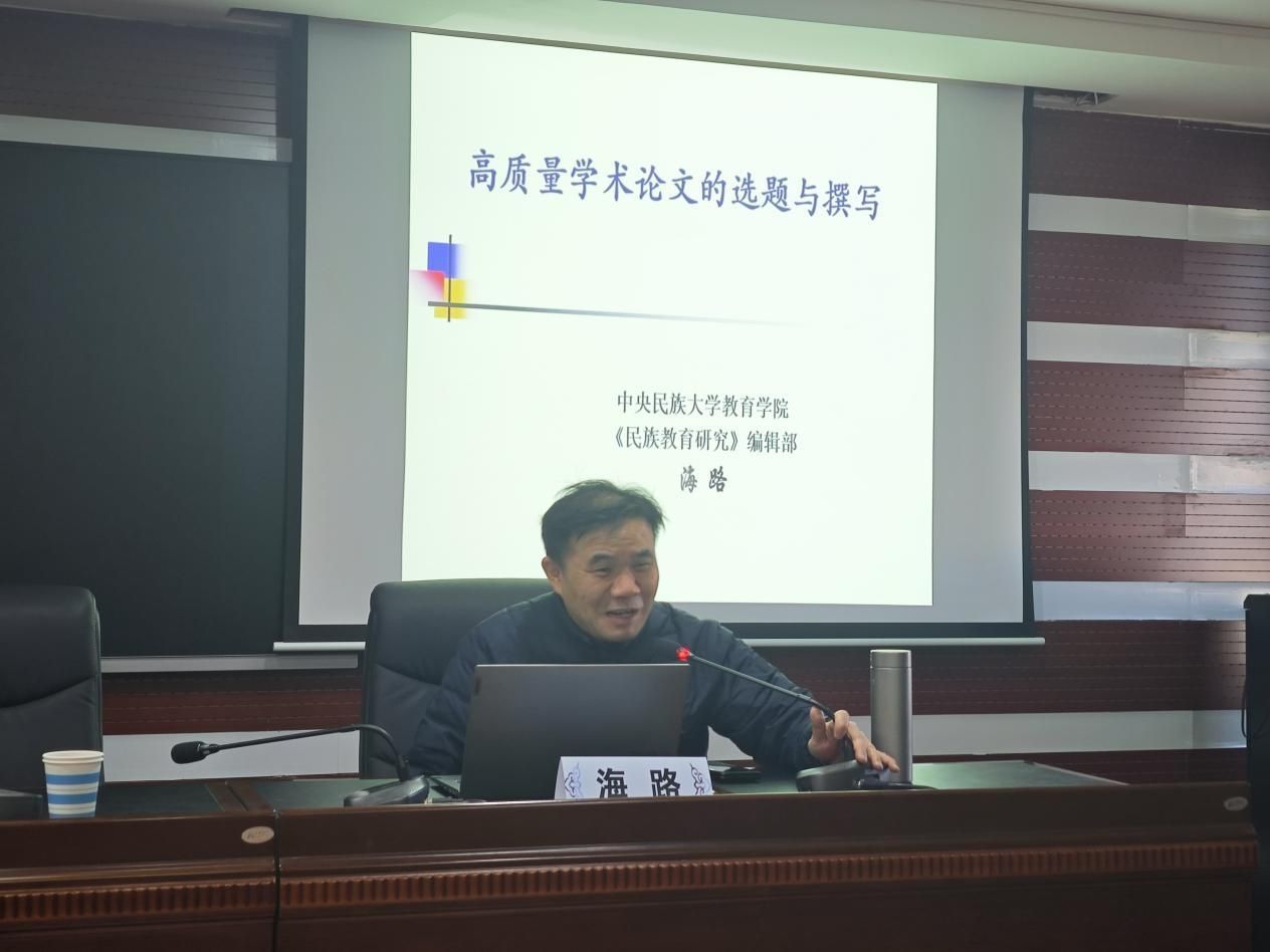 為提升師生學(xué)術(shù)論文撰寫能力,12月8日,教育學(xué)院聯(lián)合校學(xué)報(bào)編輯部邀請(qǐng)中央民族大學(xué)教育學(xué)院博士生導(dǎo)師、《民族教育研究》副主編海路副教授,在尚志樓413作“高質(zhì)量學(xué)術(shù)論文的選題與撰寫”專題講座,講座由教育學(xué)院院長哈達(dá)主持。