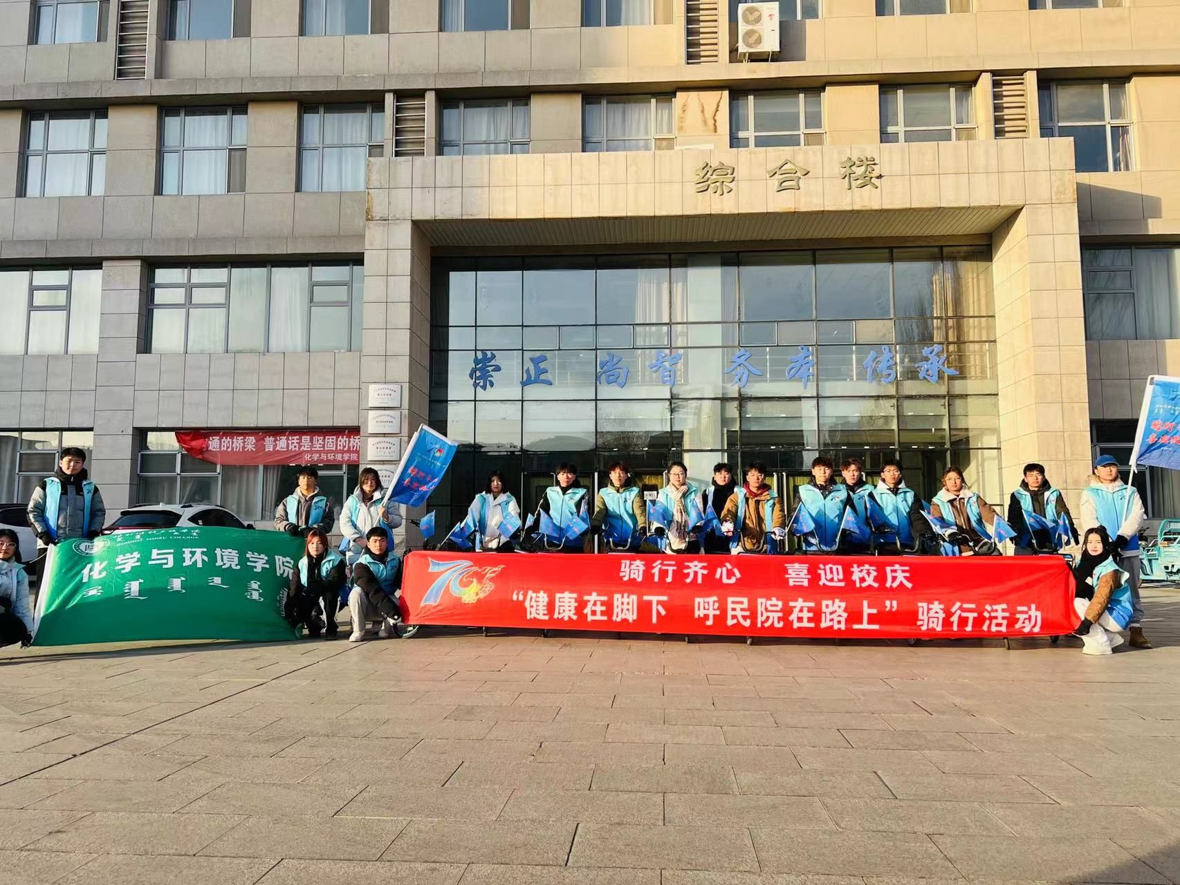 為喜迎70周年校慶,營(yíng)造良好校慶氛圍,激發(fā)同學(xué)們的愛校熱情,11月25日,化學(xué)與環(huán)境學(xué)院組織30余名學(xué)生干部開展“騎行齊心 喜迎校慶——健康在腳下 呼民院在路上”校慶主題騎行活動(dòng)。