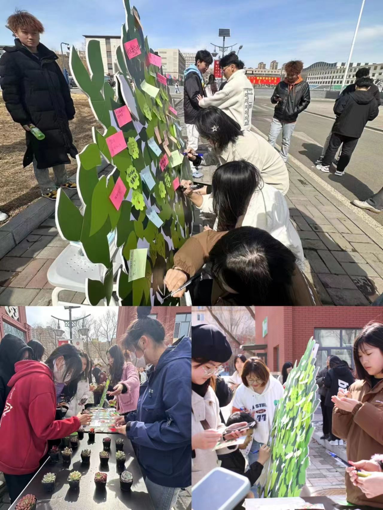 本次活動包括“線上答題送綠植”、“禁止焦‘綠’”寫寄語等環(huán)節(jié)。在和煦溫暖的春日陽光中,現(xiàn)場同學們都積極踴躍參與到活動中來,答題時刻氣氛熱烈;同學們以“春暖花開 ?‘植’得期待”為主題,將自己對植樹造林、環(huán)境保護、未來期待等美好向往的寄語貼到大樹上,并以簽名的方式為本次活動留下自己的印跡。