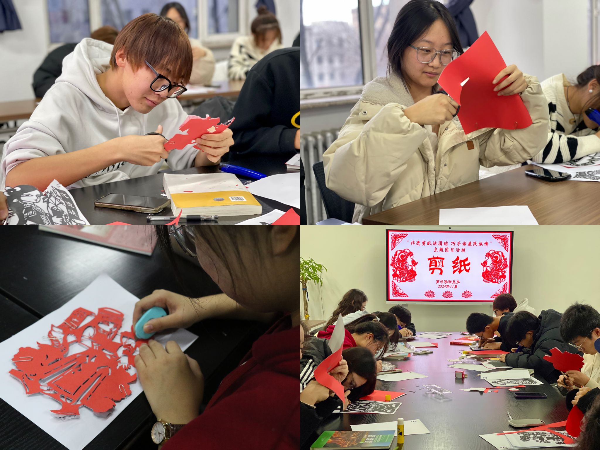 為進一步鑄牢中華民族共同體意識,深刻貫徹習近平總書記關于加強“文化遺產保護傳承,弘揚中華優秀傳統文化”的重要論述。將美育工作作為立德樹人的重要載體,堅持以美育人、以美化人,積極推動德育、智育、美育、體育、勞動教育融合發展,11月30日,商學院在尚智樓 310 會議室開展“非遺剪紙話團結 巧手傳遞民族情”主題團日活動。