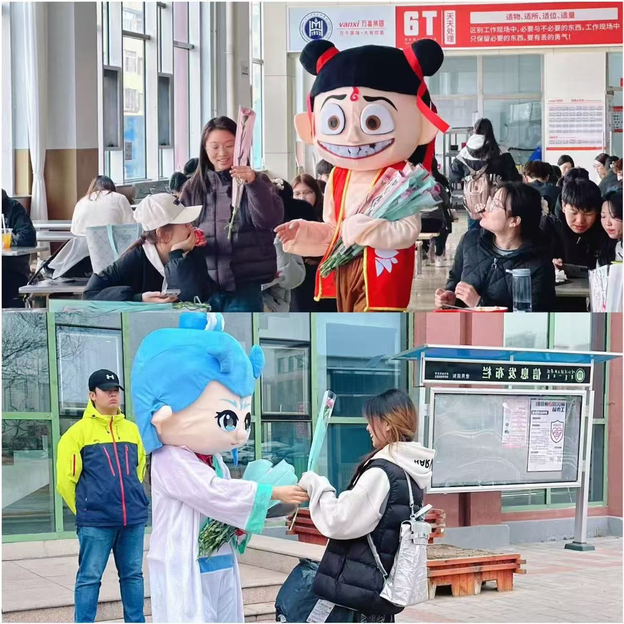 活動現場,學生志愿者裝扮的吉祥人偶為每位前來食堂就餐的女師生員工捧送鮮花,同時也為她們準備了節日蛋糕和優惠特色菜品。校領導深入教職工餐廳,向辛勤耕耘在教育一線的全體女教職工致以最誠摯的節日祝賀。