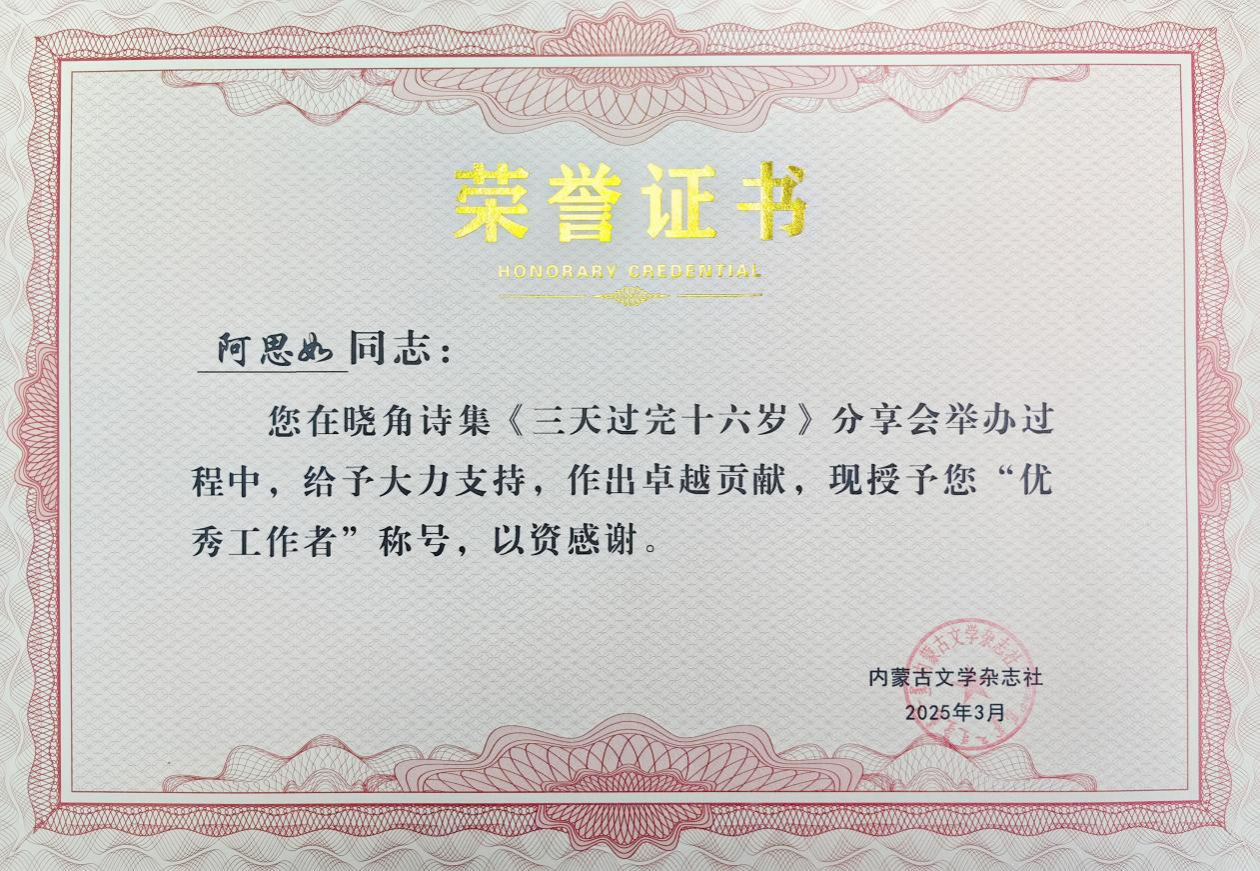 內蒙古文學雜志社頒發榮譽證書,對我校師生支持詩歌活動開展、支持內蒙古文學事業發展進行表彰感謝。黨委宣傳部獲得“優秀承辦單位”稱號,阿思如等34名師生獲得“優秀工作者稱號”。