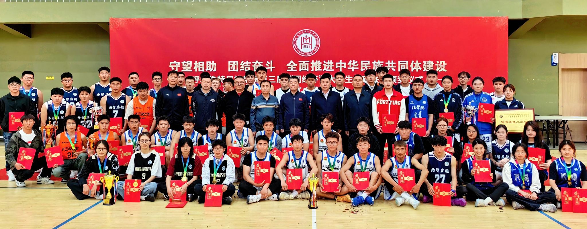 為全面貫徹落實黨的二十大精神,深入學習貫徹習近平新時代中國特色社會主義思想,持續深化鑄牢中華民族共同體意識,深入貫徹中央八項規定精神學習教育,提高為學生辦事實效率,推進學校“23456”民族團結進步創建工程,促進各民族學生交往交流交融,活躍校園文化活動,培養學生團隊合作精神,有效提高大學生身體素質水平,黨委統戰部、學生工作部、體育學院于4月21日至5月8日聯合舉辦了“守望相助、團結奮斗,全面推進中華民族共同體建設”第三屆“團結杯”大學生籃球聯賽。來自各學院的18支男子隊伍(含1支教職工籃球隊)和9支女子隊伍報名參賽,賽事分別進行了男子組50場、女子組45場比賽。校黨委委員、統戰部部長朝格吉樂圖,體育學院院長烏日根牧仁等相關部門和單位負責人出席頒獎儀式并現場觀看決賽。