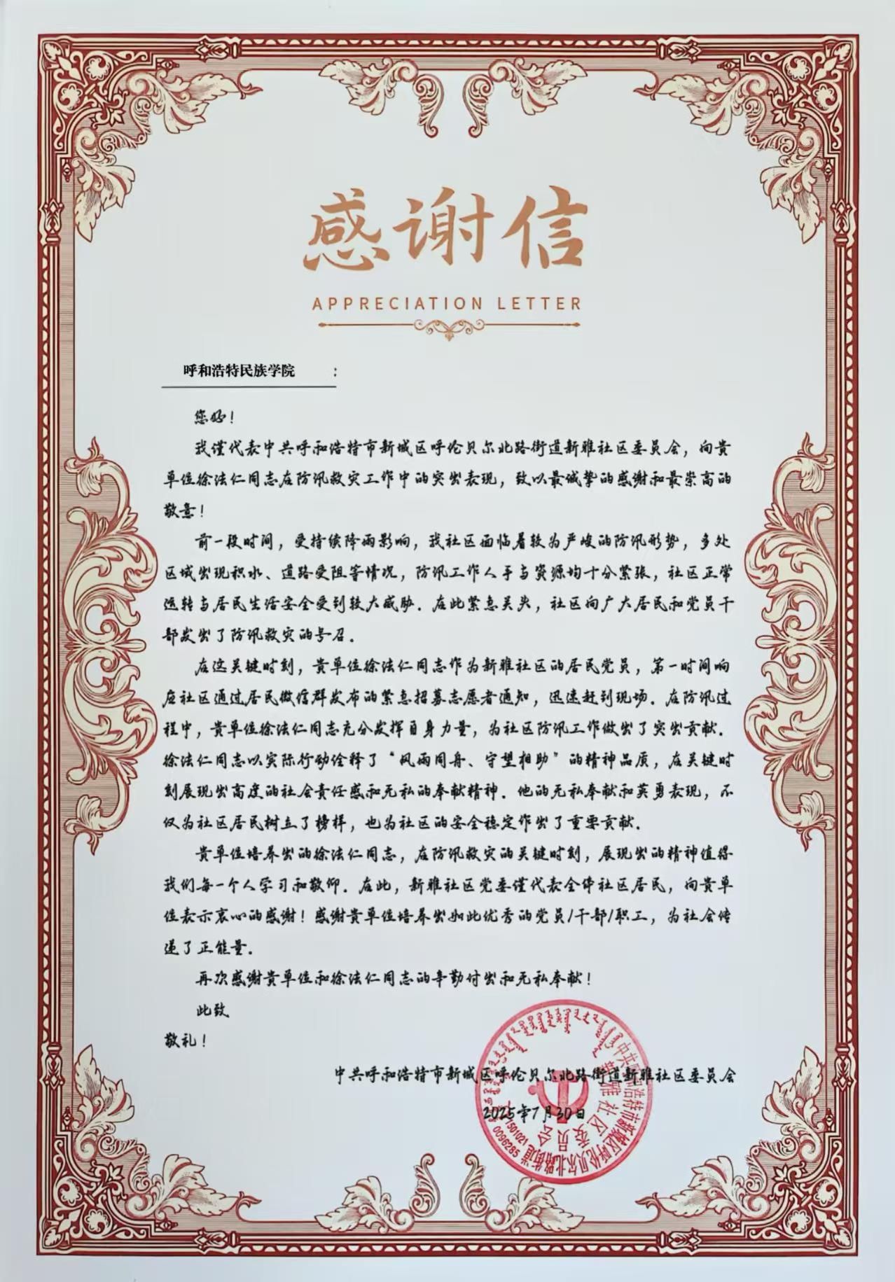 近日,學(xué)校收到新雅社區(qū)委員會(huì)發(fā)來(lái)的感謝信,對(duì)我校財(cái)務(wù)處黨支部徐法仁同志在社區(qū)抗洪救災(zāi)中做出的貢獻(xiàn)表示了衷心的感謝和崇高的敬意!