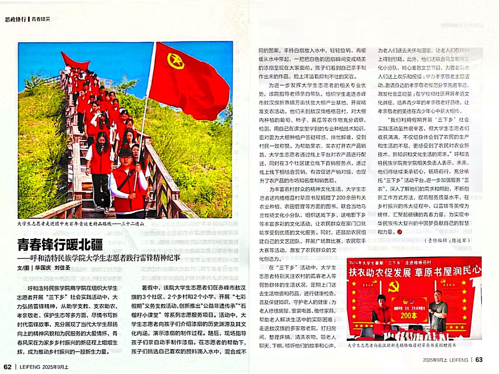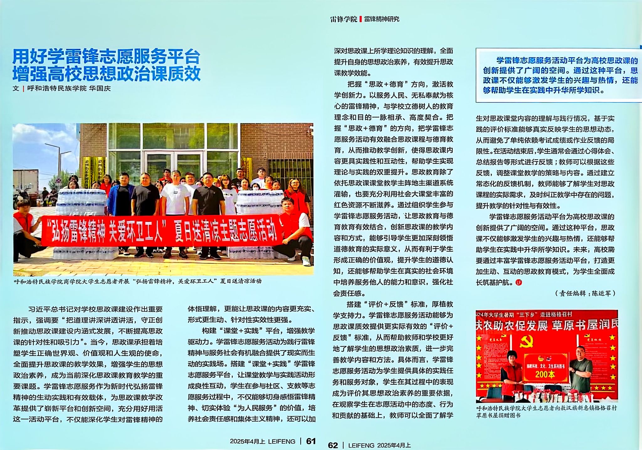 近日,《雷鋒》雜志刊發我校商學院文章《用好學雷鋒志愿服務平臺 增強高校思想政治課質效》《青春鋒行暖北疆——呼和浩特民族學院大學生志愿者踐行雷鋒精神紀事》。