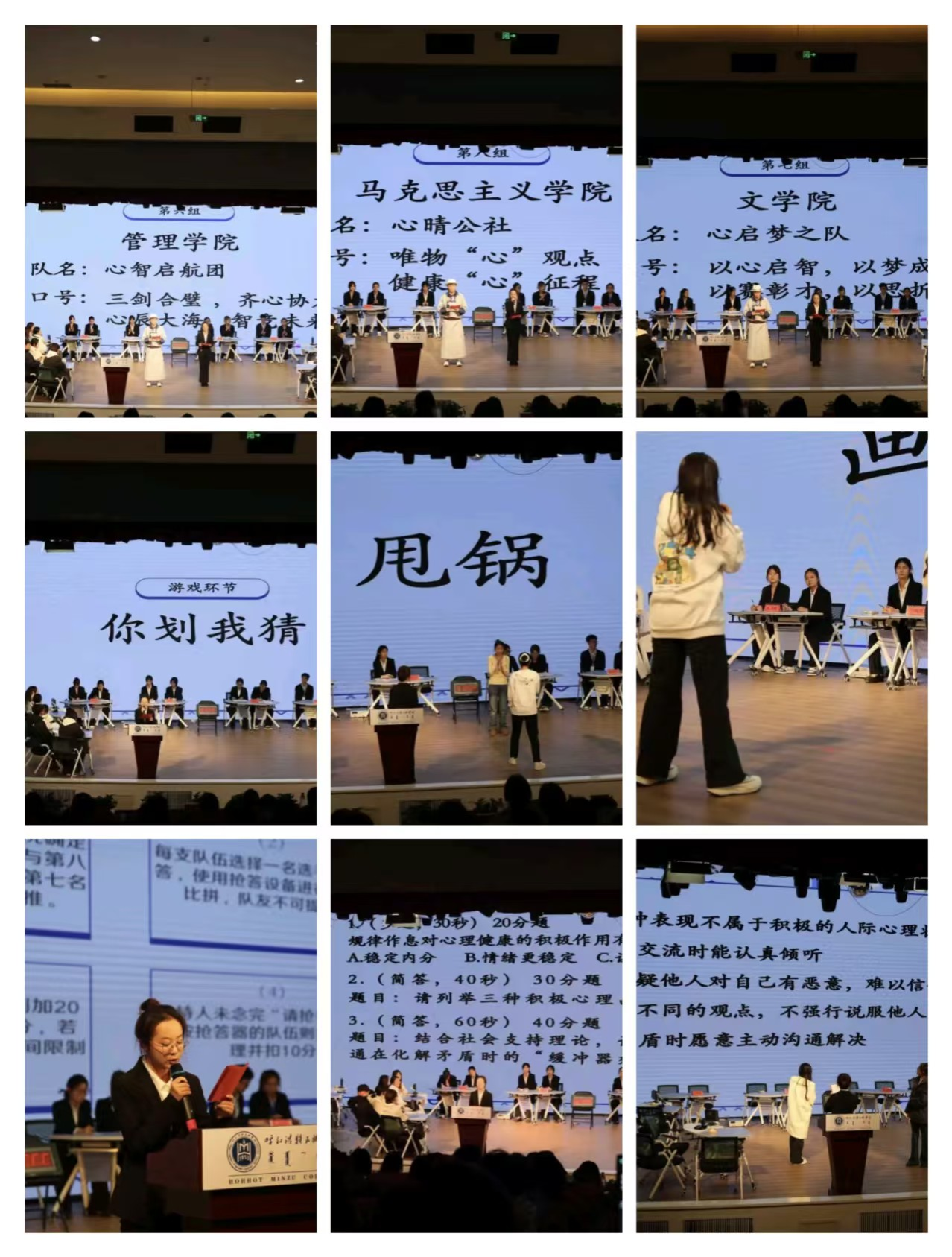 本次競賽由黨委學生工作部心理健康教育中心專職教師肖扎力嘎胡、蘇飛琴,專職輔導員智重洋、霍文新擔任評委,共有8支學院代表隊晉級決賽,600余名師生到場觀賽。決賽設置“勢在必得”必答題、“分秒必爭”搶答題、“爭鋒相對”對抗題、“險中求勝”風險題及“一錘定音”生死題五個環節,各環節環環相扣;必答題考驗基礎素養,搶答題點燃賽場氛圍,對抗題展現一對一比拼智慧,風險題挑戰選手決策勇氣,最終通過精彩絕倫的對決定勝負。