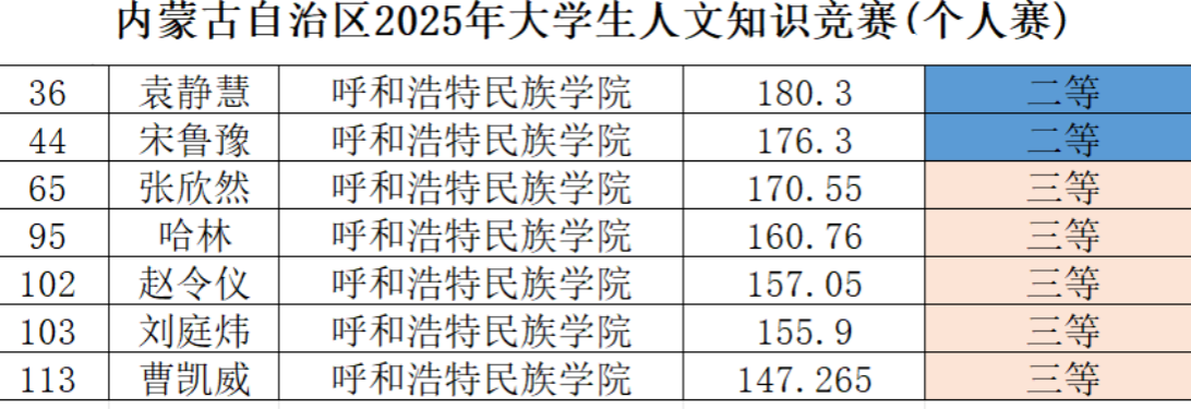 近日,內蒙古自治區“觀乎人文,化成天下”2025年大學生人文知識競賽決賽圓滿落幕。我校學子憑借扎實的人文素養、敏銳的思維能力與穩定的臨場發揮,在激烈角逐中脫穎而出,最終斬獲個人賽二等獎2項、三等獎5項,團體賽亞軍,充分展現了青年學子傳承文化根脈、勇擔時代使命的精神風貌。