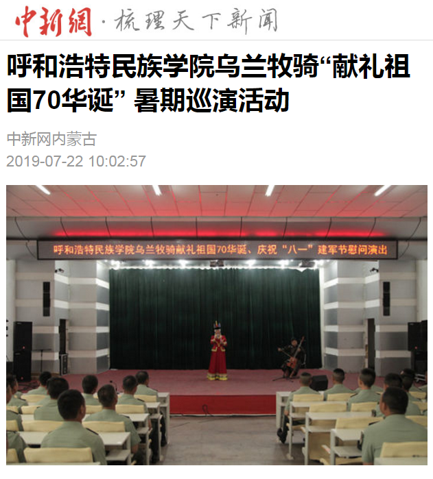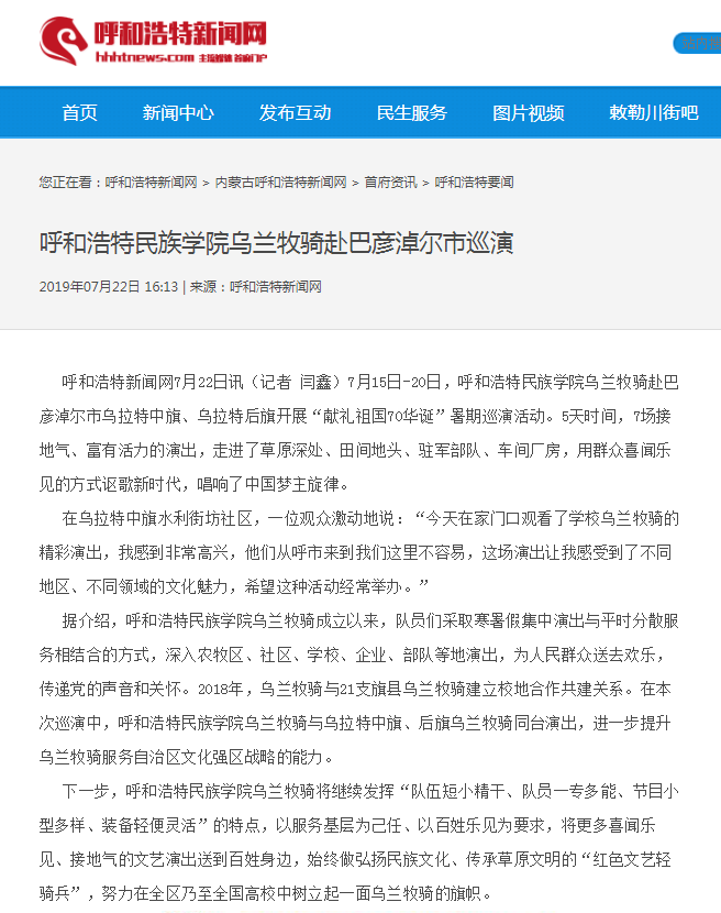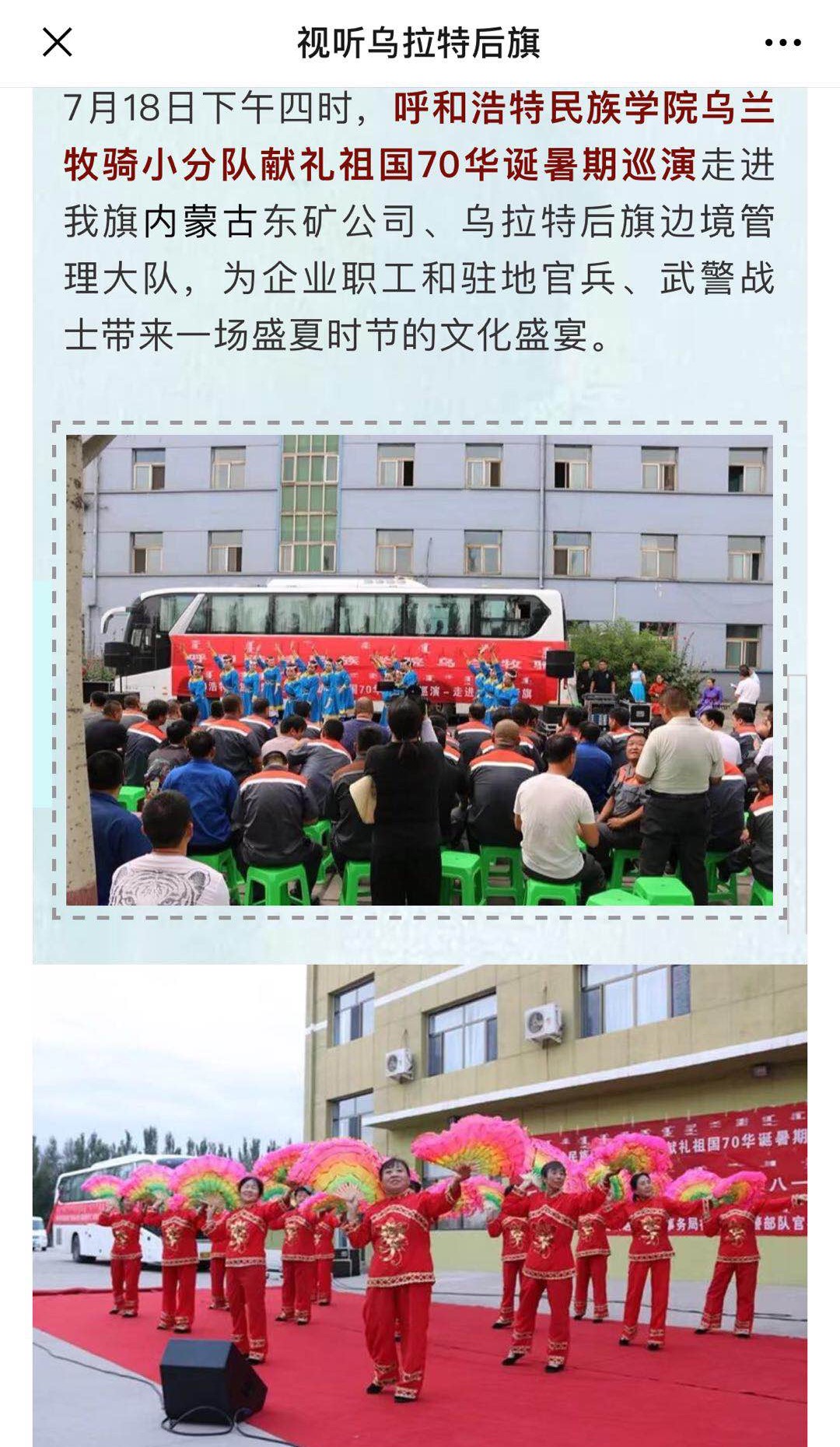 7月15日——20日,我校烏蘭牧騎赴巴彥淖爾深入農村、牧區、企業、軍營、社區,開展“獻禮祖國70華誕”暑期巡演活動。