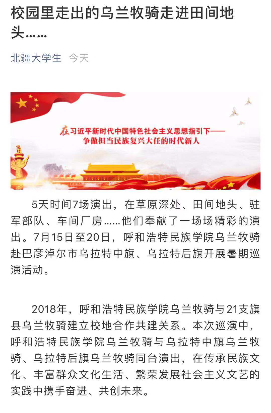本次巡演以習近平總書記給烏蘭牧騎隊員回信和重要指示精神為指導,扎根沃土,服務群眾,將七場接地氣、群眾喜聞樂見的文藝演出送到了田間地頭、車間廠房、駐軍部隊和社區群眾身邊,得到了媒體的廣泛關注。人民網、內蒙古電視臺蒙漢文頻道、內蒙古融媒體、中國新聞網(含公眾號)、呼和浩特新聞網、北疆大學生公眾號、內蒙古旅游報、巴彥淖爾市電視臺等10余家新聞媒體進行了報道和直播,進一步向社會展現了我校烏蘭牧騎的風采。