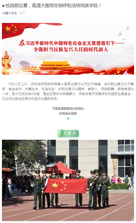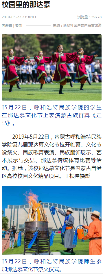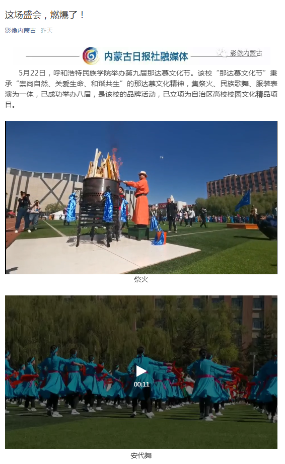 自學(xué)校那達慕文化節(jié)開幕以來,《人民日報》《中國日報》等30家中央和省部級新聞媒體深入校園,對學(xué)校第九屆校園那達慕文化節(jié)進行采訪,報道此次校園盛會。