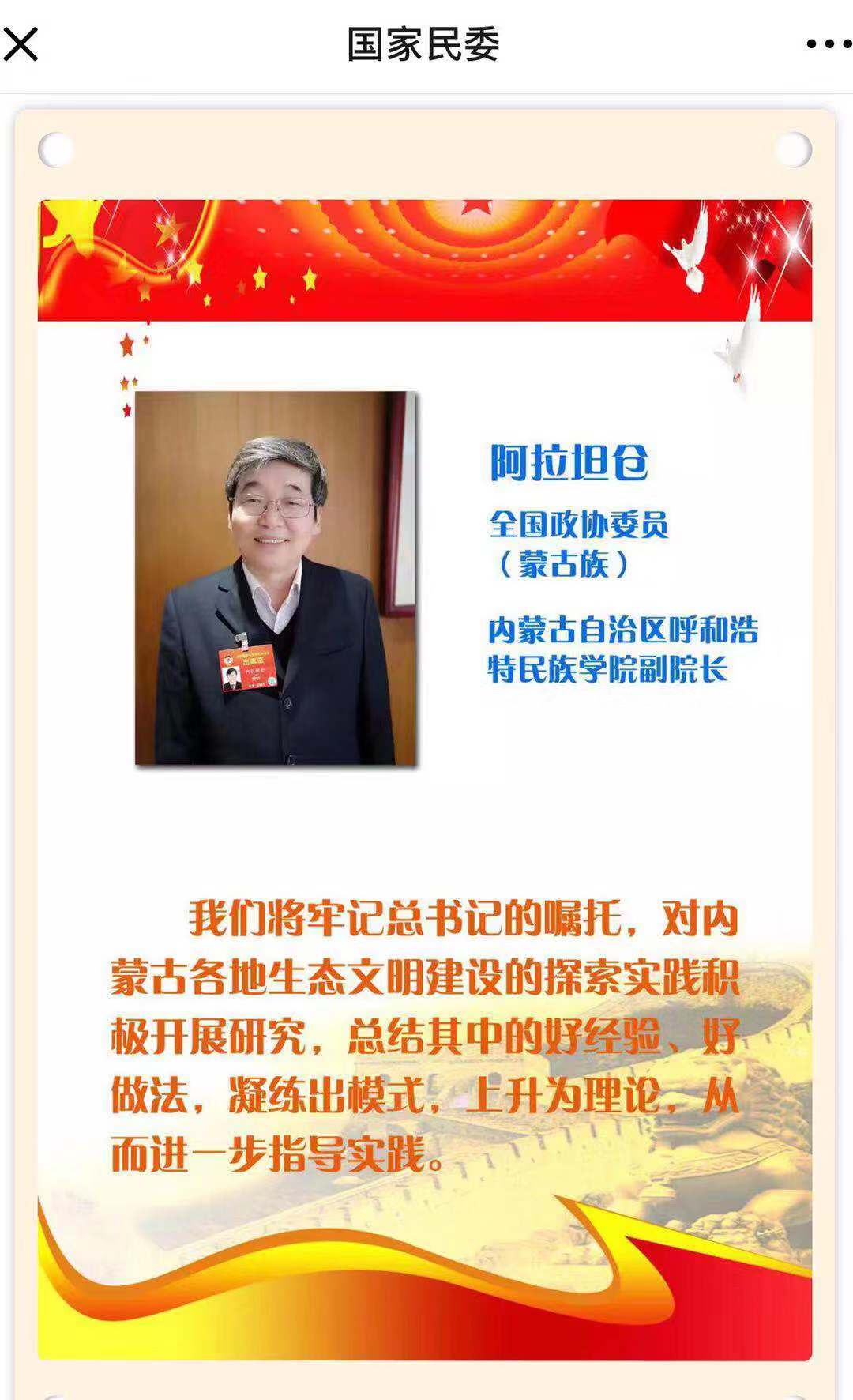 3月3日,政協(xié)十三屆二次會(huì)議在北京人民大會(huì)堂開(kāi)幕,全國(guó)政協(xié)委員、博士生導(dǎo)師、呼和浩特民族學(xué)院黨委委員、副院長(zhǎng)阿拉坦倉(cāng)教授參加了會(huì)議。