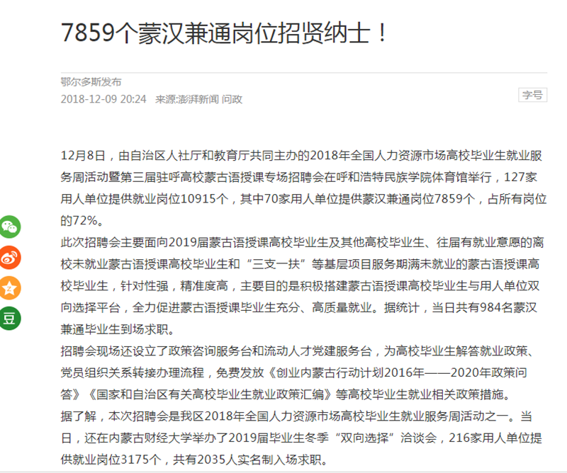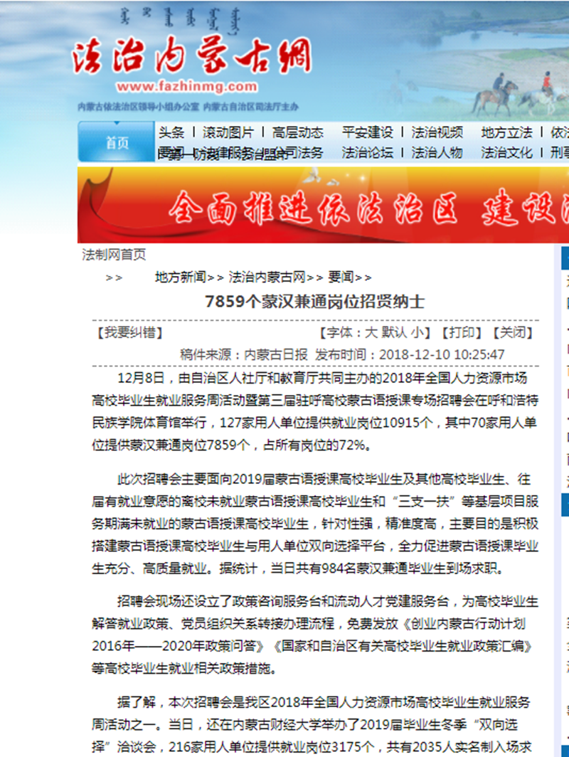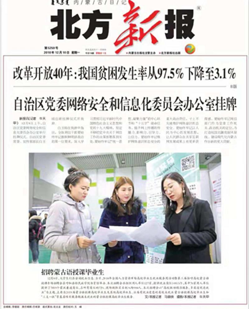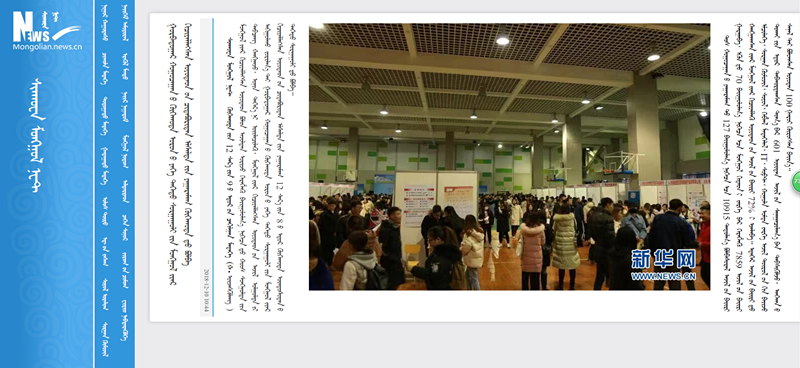 12月8日,第三屆駐呼高校蒙古語授課生專場招聘會在我校舉行。連日來,《北方新報》、《呼和浩特日報》、人民網(wǎng)、新華網(wǎng)(蒙文)、內(nèi)蒙古客戶端、中國新聞網(wǎng)、北疆大學(xué)生等主流媒體對活動進(jìn)行了跟蹤報道。新浪網(wǎng)、澎湃網(wǎng)、內(nèi)蒙古法制網(wǎng)等6家媒體進(jìn)行了轉(zhuǎn)載報道。通過媒體的廣泛關(guān)注,進(jìn)一步擴(kuò)大了我校的知名度、美譽(yù)度,有力地推進(jìn)了蒙古語授課畢業(yè)生就業(yè)擇業(yè)工作。