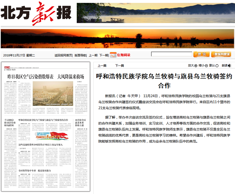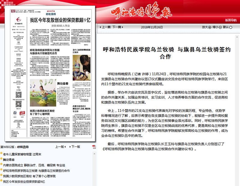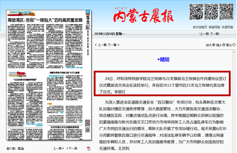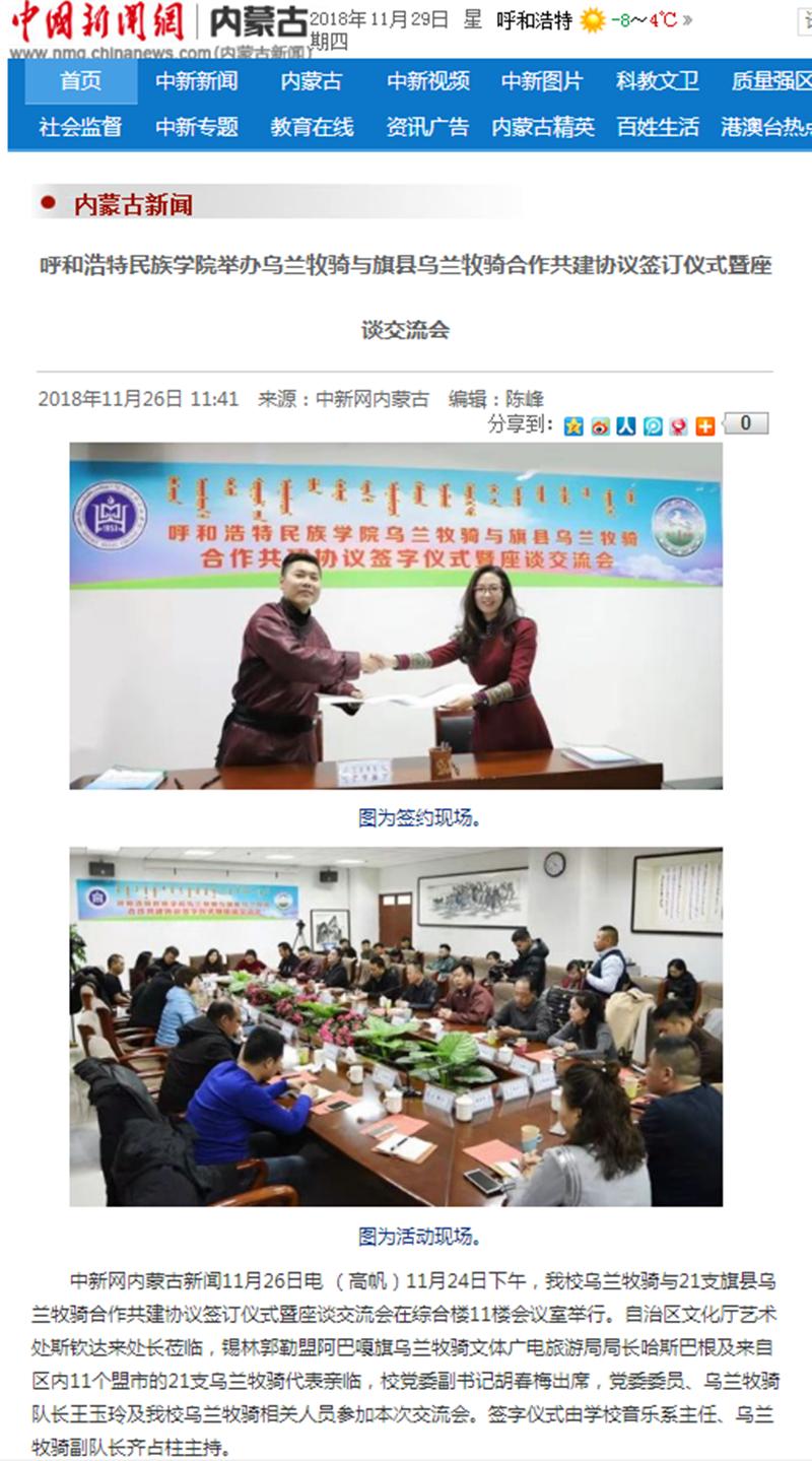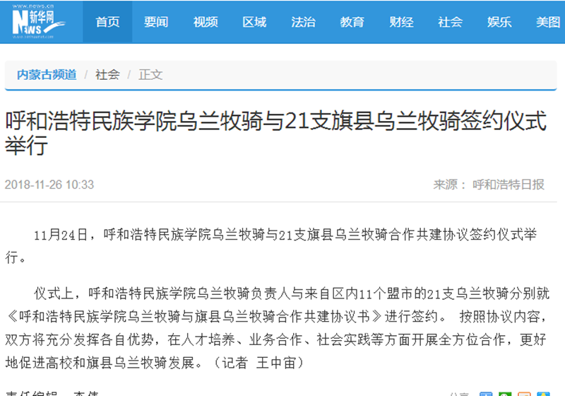 11月24日,我校烏蘭牧騎與21家旗縣烏蘭牧騎舉行舉行簽字儀式,并就下一步合作共建進(jìn)行交流座談。連日來(lái),內(nèi)蒙古廣播電視臺(tái)、呼和浩特廣播電視臺(tái)、《內(nèi)蒙古日?qǐng)?bào)》(蒙漢文版)、《北方新報(bào)》、《呼和浩特日?qǐng)?bào)》、《呼和浩特晚報(bào)》、新華網(wǎng)、中國(guó)新聞網(wǎng)、呼和浩特新聞網(wǎng)、呼和浩特廣播電臺(tái)等12家自治區(qū)主流媒體對(duì)活動(dòng)進(jìn)行了報(bào)道,內(nèi)蒙古新聞網(wǎng)、新浪網(wǎng)等8家媒體進(jìn)行了轉(zhuǎn)載報(bào)道。通過(guò)媒體的廣泛關(guān)注,進(jìn)一步展示我校烏蘭牧騎隊(duì)伍的風(fēng)采,提高了我校烏蘭牧騎的影響力。
